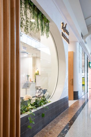 Adding pops of natural greenery creates a sanctuary vibe and distinct focal points. Creating unique and enticing forms to the shopfront are important to this corner tenancy, as attracting passing customers is very important.